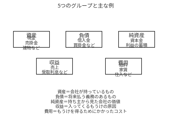 「資産・負債・純資産・収益・費用」という5つのグループを、