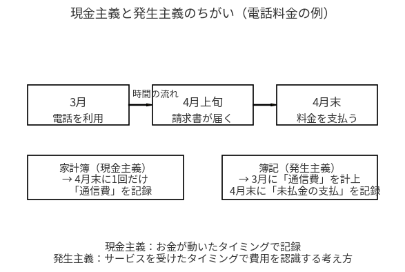 この違いを、図2:現金主義と発生主義のちがい(電話料金の例)で整理しています。