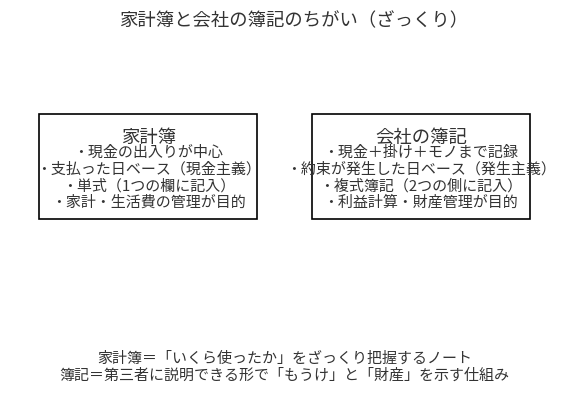 図1:家計簿と会社の簿記のちがい(ざっくり)では、